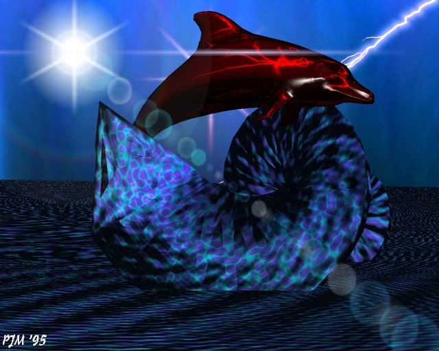 This is a strange render of a red chrome dolphin and a surreal snakey